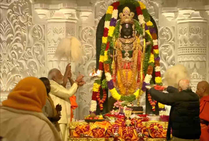 అయోధ్యలో చారిత్రక ఘట్టం ఆవిష్కృతమైంది. యావత్‌దేశం వేచిచూసిన సుదీర్ఘ స్వప్నం సాకారమైంది. ఎన్నో శతాబ్ధాల కల నెరవేరింది. వేద మంత్రాలు, మంగళ వాయిద్యాల మధ్య అయోధ్య గర్భగుడిలో మధ్యామ్నం 12.29 గంటలకు రామ్‌లలాకు ప్రాణ ప్రతిష్ఠ కత్రువు పూర్తి చేశారు. అభిజిత్‌ లగ్నంలో ప్రధాని మోదీ శ్రీరాముడి విగ్రహాన్ని ప్రతిష్ఠించారు. మొత్తం 84 సెకన్ల పాటు ప్రాణ ప్రతిష్ఠ కార్యక్రమం కొనసాగింది. అనంతరం బాల రాముడి పాదాలపై పూలువేసి నమ్రతతో నమస్కరించారు. ఈ వైభవాన్ని దేశ ప్రజలు, రామభక్తులంతా లైవ్‌లో కన్నులారా వీక్షించారు.