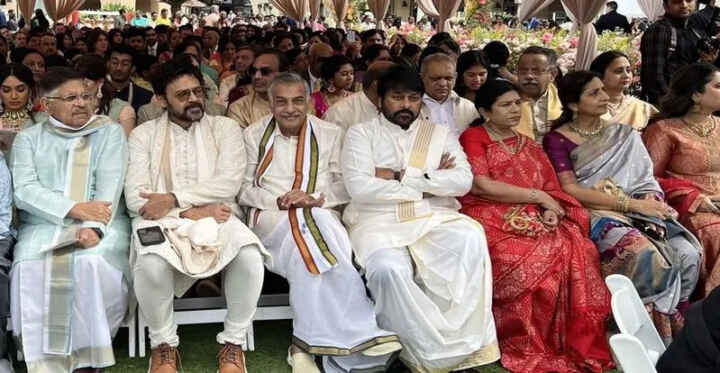 తాజాగా ఆ వివాహా వేడుకలో చిరంజీవి సాంప్రదాయ దుస్తులు ధరించి అతిధులందరితో కలిసి కూర్చోని ఉన్న ఓ ఫొటో ఇప్పుడు నెట్టింట బాగా వైరల్ అవుతోంది.ఆ ఫొటోలో చిరంజీవితో పాటు విక్టరీ వెంకటేశ్ మరి కొంత మంది ప్రముఖులు కూడా ఉన్నారు.