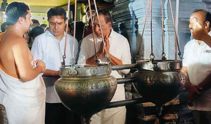 శుక్రవారం ఉదయం రామగుండం ఎన్టీపీసీ నుంచి కన్నెపల్లికి బయల్దేరి వెళ్లిన ఎమ్మెల్యేలు, ఎమ్మెల్సీలు.. మంచిర్యాల జిల్లా ఇందారం వద్ద నీటి ప్రవాహం లేక ఎండిపోయిన గోదావరి నదిని పరిశీలించారు. అనంతరం కాళేశ్వరం ఆలయానికి చేరుకున్న కేటీఆర్కు ఆలయ అర్చకులు ఘన స్వాగతం పలికారు. స్వామి సన్నిధిలో కేటీఆర్ ప్రత్యేక పూజలు చేశారు. పూజల అనంతరం కన్నెపల్లి పంపు హౌజ్కు చేరుకోనున్నారు. పంప్ హౌస్ను పరిశీలించిన అనంతరం మీడియాతో కేటీఆర్ మాట్లాడుతారు.