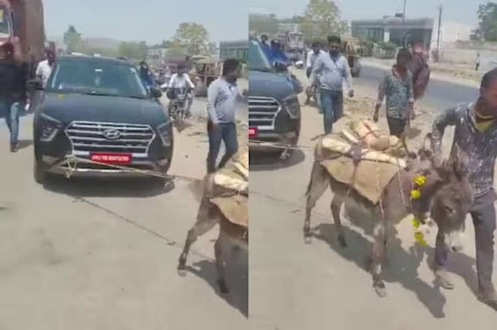 లగ్జరీ కారును గాడిదతో లాగిస్తూ షోరూంకు..