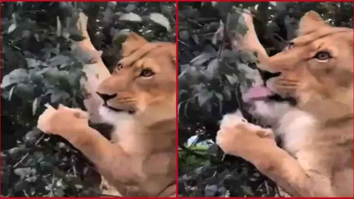 ఇదేంటీ.. గడ్డి, ఆకులు తింటున్న సింహం.. వీడియో వైరల్
