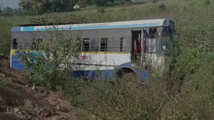 అదుపుతప్పి పొలాల్లోకి దూసుకెళ్లిన ఆర్టీసీ బస్సు.. 46 మంది ప్రయాణికులు..