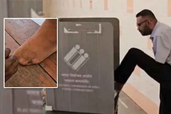 రెండు చేతులు లేకపోయినా.. బాధ్యతగా కాలితో ఓటేశాడు..
