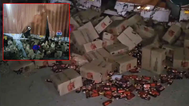 మద్యంతో వెళ్తున్న లారీ రోడ్డుపై బోల్తా.. సెకన్లలో ఎత్తుకుపోయిన జనాలు