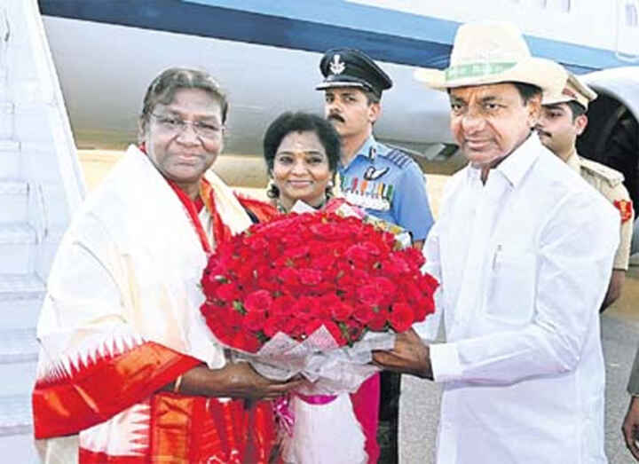 రెండు రోజుల పర్యటన నిమిత్తం శుక్రవారం హైదరాబాద్కు విచ్చేసిన రాష్ట్రపతి ద్రౌపతి ముర్ముకు ఘన స్వాగతం లభించింది. భారత వాయుసేనకు చెందిన ప్రత్యేక విమానంలో ఢిల్లీ నుంచి బేగంపేటకు చేరుకున్న ఆమెకు గవర్నర్ డాక్టర్ తమిళి సై సౌందర రాజన్, ముఖ్యమంత్రి కేసీఆర్ పుష్పగుచ్ఛాలిచ్చి స్వాగతం పలికారు. రాష్ట్రపతికి వారు శాలువాలు కప్పి సన్మానించారు. ఆమెకు స్వాగతం పలికిన వారిలో కేంద్ర మంత్రి కిషన్రెడ్డి, రాష్ట్ర మంత్రులు మహమూద్ అలీ, తలసాని శ్రీనివాస యాదవ్, సబితా ఇంద్రారెడ్డి, సత్యవతి రాథోడ్, మల్లారెడ్డి, జీహెచ్ఎమ్సీ మేయర్ గద్వాల విజయలక్ష్మి తదితరులున్నారు. బేగంపేట విమానాశ్రయం నుంచి రాష్ట్రపతి నేరుగా రాజ్భవన్కు చేరుకున్నారు.