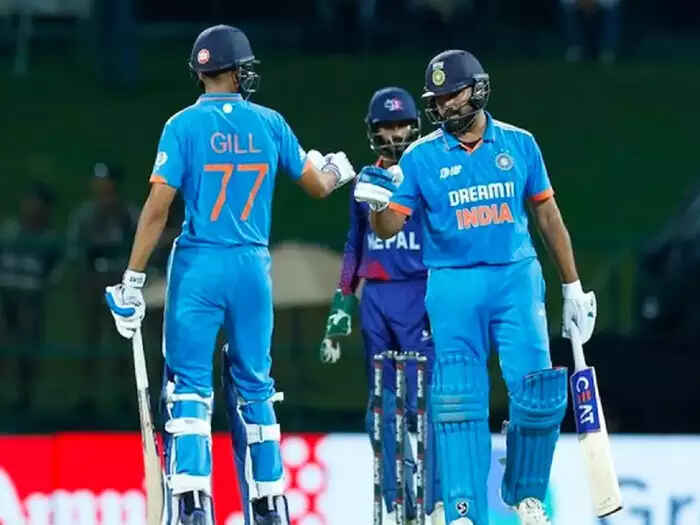 అనంతరం ఛేజింగ్ మొదలుపెట్టిన భారత్.. 2.1 ఓవర్లలో 17/0 పరుగులు చేసిన దశలో వర్షం మ్యాచ్కు అంతరాయం కలిగించింది. దీంతో ఆట చాలా సేపు నిలిచిపోయింది. చివరకు వర్షం తగ్గడంతో డక్వర్త్ లూయిస్ పద్దతిలో లక్ష్యాన్ని 23 ఓవర్లలో 145గా అంపైర్లు కుదించారు. భారత ఓపెనర్లు రోహిత్ శర్మ, శుభ్మన్ గిల్లు నేపాల్ బౌలర్లకు ఎలాంటి అవకాశం ఇవ్వలేదు. ఎడాపెడా ఫోర్లు, సిక్సర్లు బాదుతూ లక్ష్యాని కరిగించారు. ఒక్కవికెట్ కూడా ఇవ్వకుండా 20.1 ఓవర్లలోనే టార్గెట్ ఫినిష్ చేశారు. రోహిత్ శర్మ(74), శుభ్మన్ గిల్(67) నాటౌట్లుగా నిలిచారు.