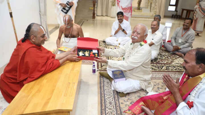 అనంతరం దివ్యసాకేతం ప్రధాన అర్చకులు మోహన్భగవత్ని వేద పఠనం చేసి ఆశీర్వదించారు. ఆ తర్వాత శ్రీశ్రీశ్రీ త్రిదండి చిన జీయర్ స్వామిని కలిసి ధ్యాన మందిరంలో కూర్చొని కాసేపు సేదతీరారు. స్వామీజీతో మాట మంతి నిర్వహించారు. సమతామూర్తి గురించి చినజీయర్ స్వామి దివ్యభాషణాన్ని అందించారు. చివరగా మోహన్ భగవత్ కు త్రిదండి చిన జీయర్ స్వామి.. శ్రీ సీతారామ లక్ష్మణ సమేత హనుమాన్ దేవతా మూర్తులతో కూడిన మంగళాశాసనం అందజేశారు. దీనిని మహాప్రసాదంగా స్వీకరించిన తరువాత ఆర్ఎస్ఎస్ చీఫ్ చిన్నజీయర్ స్వామి, ఉత్తరాధికారితో కలిసి మధుర జ్ఙాపకాలకు ప్రతీకగా ఫోటో దిగారు.