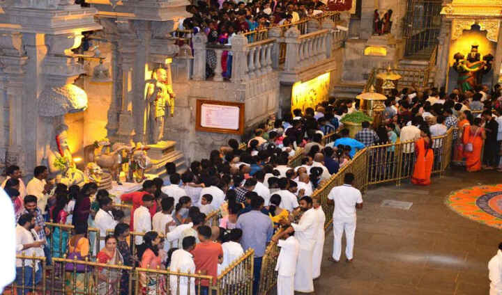 యాదగిరిగుట్టకు భక్తులు పోటెత్తారు. ఆదివారం సెలవు కావడంతో పెద్ద సంఖ్యలో తరలివచ్చి లక్ష్మీనరసింహ స్వామిని దర్శించుకున్నారు. భక్తజనంతో ఆలయ మాఢవీధులు, క్యూలైన్లు, ప్రసాద విక్రయశాలలు కిక్కిరిసిపోయాయి. లక్ష్మీనరసింహస్వామి సన్నిధిలో భక్తుల కొలాహలం(Crowd) నెలకొన్నది. ఆదివారం సెలవు కావడంతో ఆలయ మాఢవీధులు, క్యూలైన్లు, ప్రసాద విక్రయశాల భక్తులతో నిండిపోయాయి. తెల్లవారుజామునే ఆలయాన్ని తెరిచిన అర్చకులు సుప్రభాతంతో స్వామివారిని మేల్కొలిపారు.