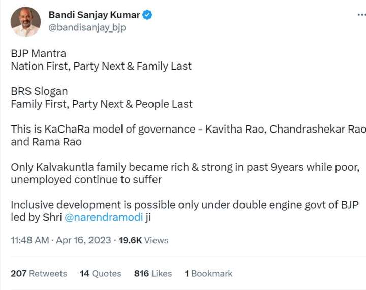 బీజేపీ రాష్ట్ర అధ్యక్షులు బండి సంజయ్ ట్విట్టర్ వేదికగా రాష్ట్ర ప్రభుత్వంపై విమర్శలు గుప్పించారు.కల్వకుంట్ల కుటుంబంది కచరా పాలన అని ఎద్దేవ చేశారు. బీజేపీ మంత్రం- నేషన్ ఫస్ట్, పార్టీ నెక్స్ట్, ఫ్యామిలీ లాస్ట్. కానీ బీఆర్ఎస్ నినాదం- కుటుంబం ఫస్ట్, పార్టీ నెక్స్ట్, పీపుల్ లాస్ట్ అని సంజయ్ సెటైర్లు వేశారు.ఇది కవిత, కేసీఆర్, కేటీఆర్ కచరా పాలనకి నమూనా అన్నారు. గత 9 ఏళ్లలో కల్వకుంట్ల కుటుంబం మాత్రమే ధనవంతులయ్యారని.. పేదలు, నిరుద్యోగులు మాత్రం కష్టాల ఊబిలో కొట్టుమిట్టాడుతున్నారని పేర్కొన్నారు. ఇక ప్రధాని మోడీ నేతృత్వంలోని బీజేపీ డబుల్ ఇంజన్ ప్రభుత్వంతో మాత్రమే సమగ్ర అభివృద్ధి సాధ్యమవుతుందని బండి సంజయ్ తెలిపారు.